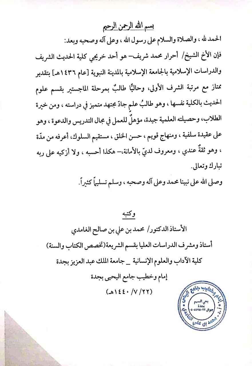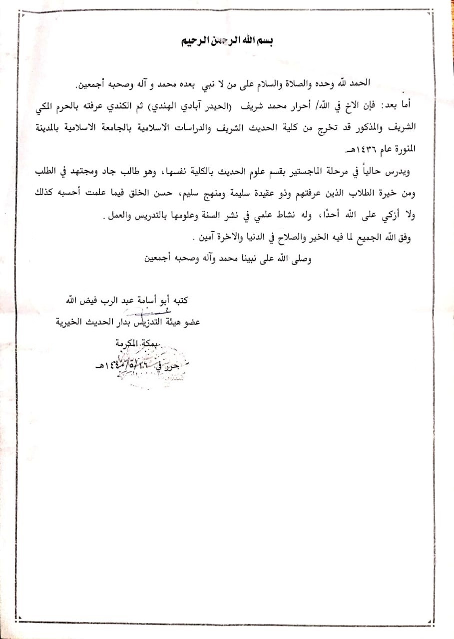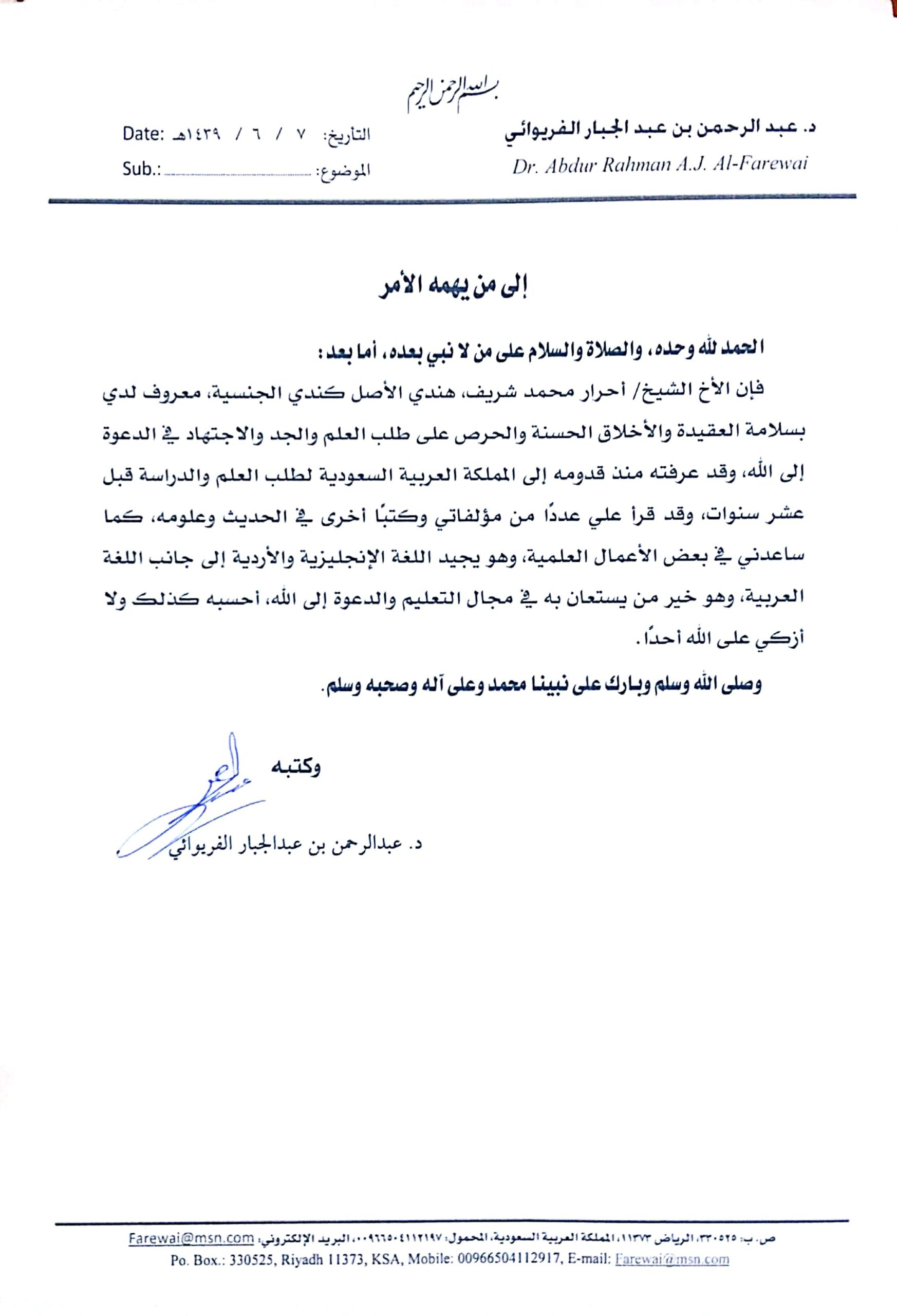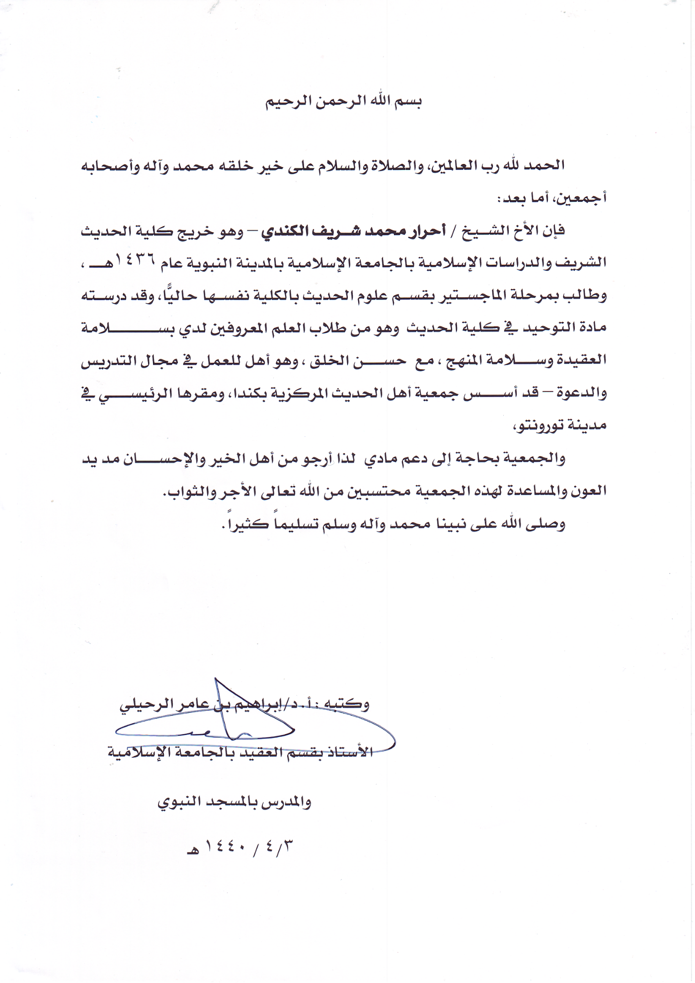 Recommendations for the President of the Ahle-Hadith Society of Canada (Ahrar Mohammed Shareef):
